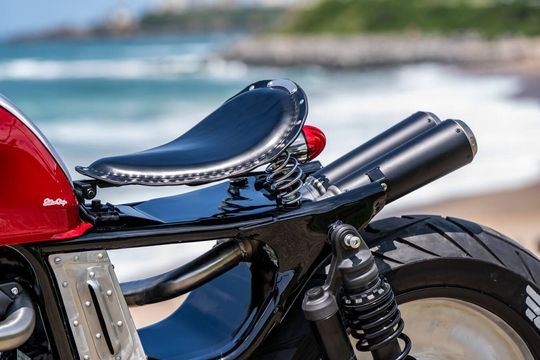 Silver Bullet to bez wątpienia klasyczna wersja prawdziwego brytyjskiego stylu Café Racer, a opływowy kształt owiewki przedniej, aluminiowy zbiornik paliwa i smukłe, pojedyncze siedzenie emanują stylem i zamysłem. Ostro pochylona kierownica typu clip-on znajduje się znacznie poniżej górnego jarzma i pasuje do tylnych podnóżków zamontowanych na pięknie wykończonych wieszakach. Plecione przewody sugerują imponującą siłę hamowania, podobnie jak przednia tarcza typu wave. A żeby jeszcze bardziej wzmocnić jego potencjał, motocykl toczy się na w pełni wyścigowych oponach typu slick.