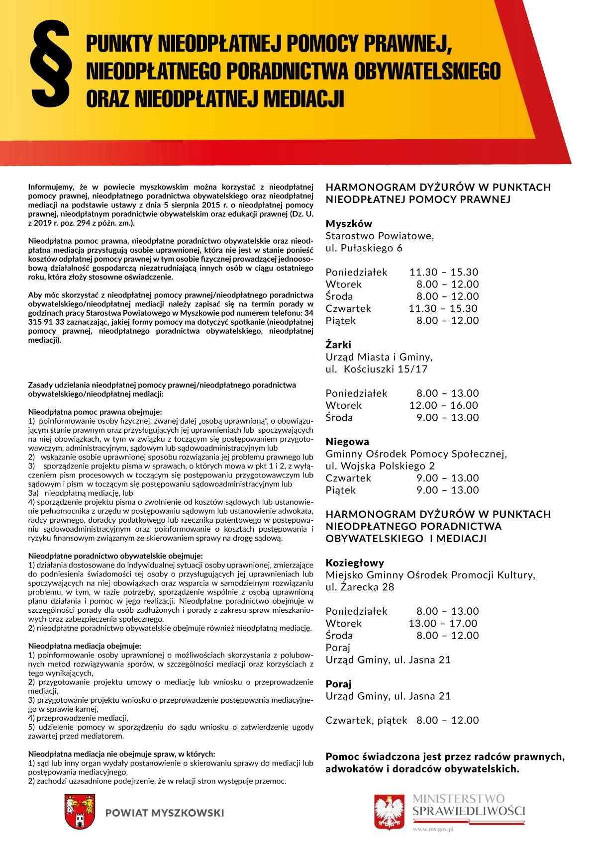 Zasady udzielania nieodpłatnej pomocy prawnej/nieodpłatnego poradnictwa obywatelskiego/nieodpłatnej mediacji.