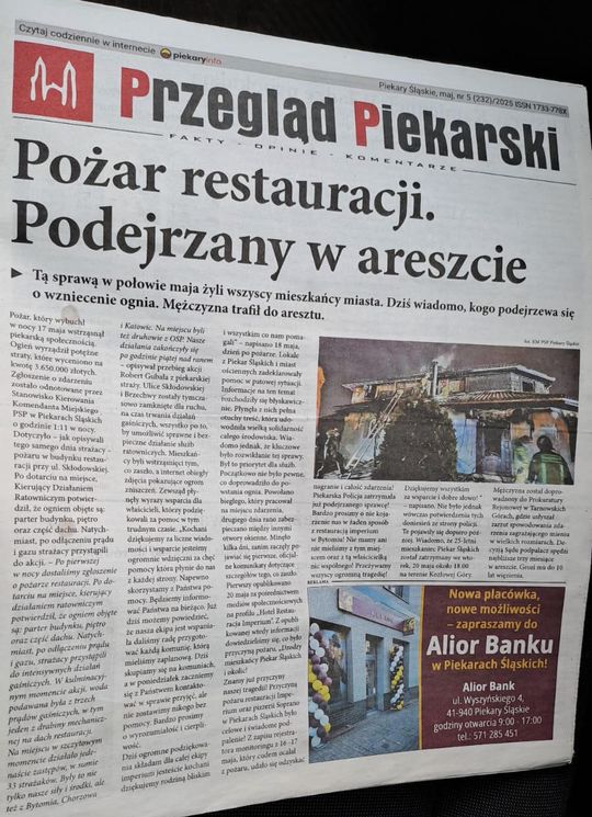 O pożarze pisał Przegląd Piekarski w artykule: „Pożar w restauracji. Podejrzany w areszcie”.