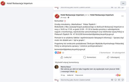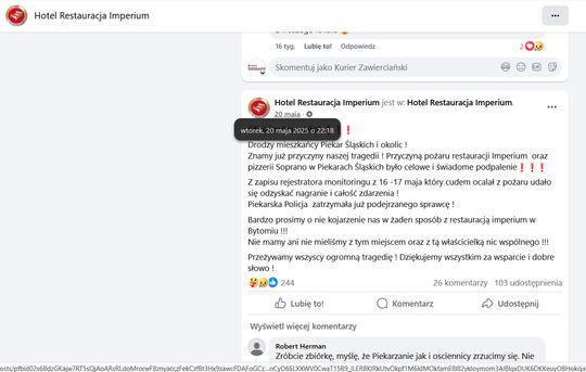 Jest w artykule Przeglądu Piekarskiego zastanawiający fragment. Gazeta cytuje profil fb „Hotel Restauracja Imperium”, wpis z 20 maja 2025: „przyczyną pożaru było celowe i świadome podpalenie! Z zapisu rejestratora monitoringu udało się odzyskać nagranie i całość zdarzenia”.