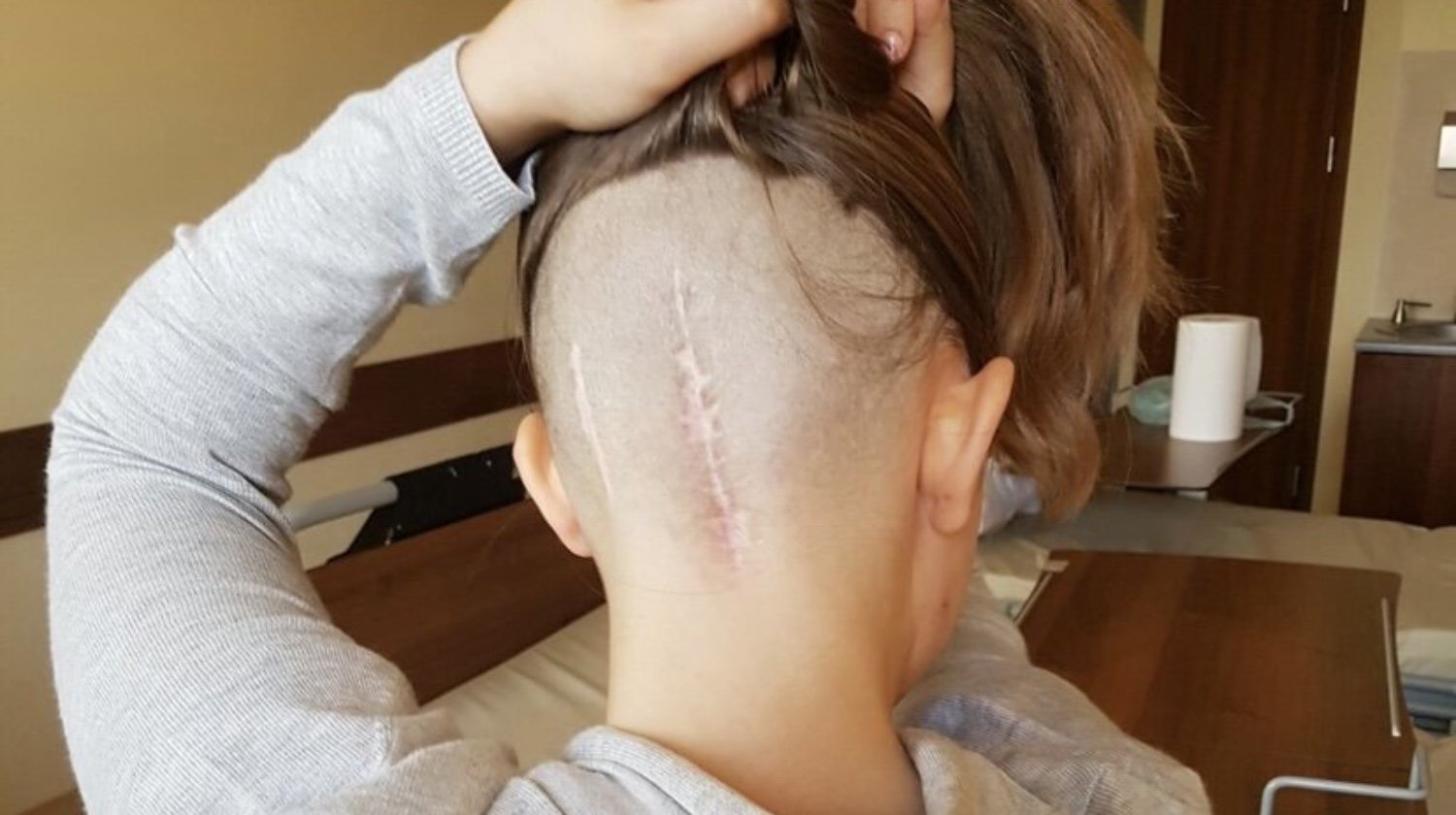 Tak też na własną rękę zaczęłyśmy ponownie szukać specjalisty, który podjąłby się biopsji. Trafiłam z polecenia na profesora operującego na Śląsku, który po konsultacji podjął się operacji. W 2017 przeszłam kraniektomię (czyli otwarcie czaszki) i częściową resekcję guza pnia mózgu i lewego konara mózgu.
