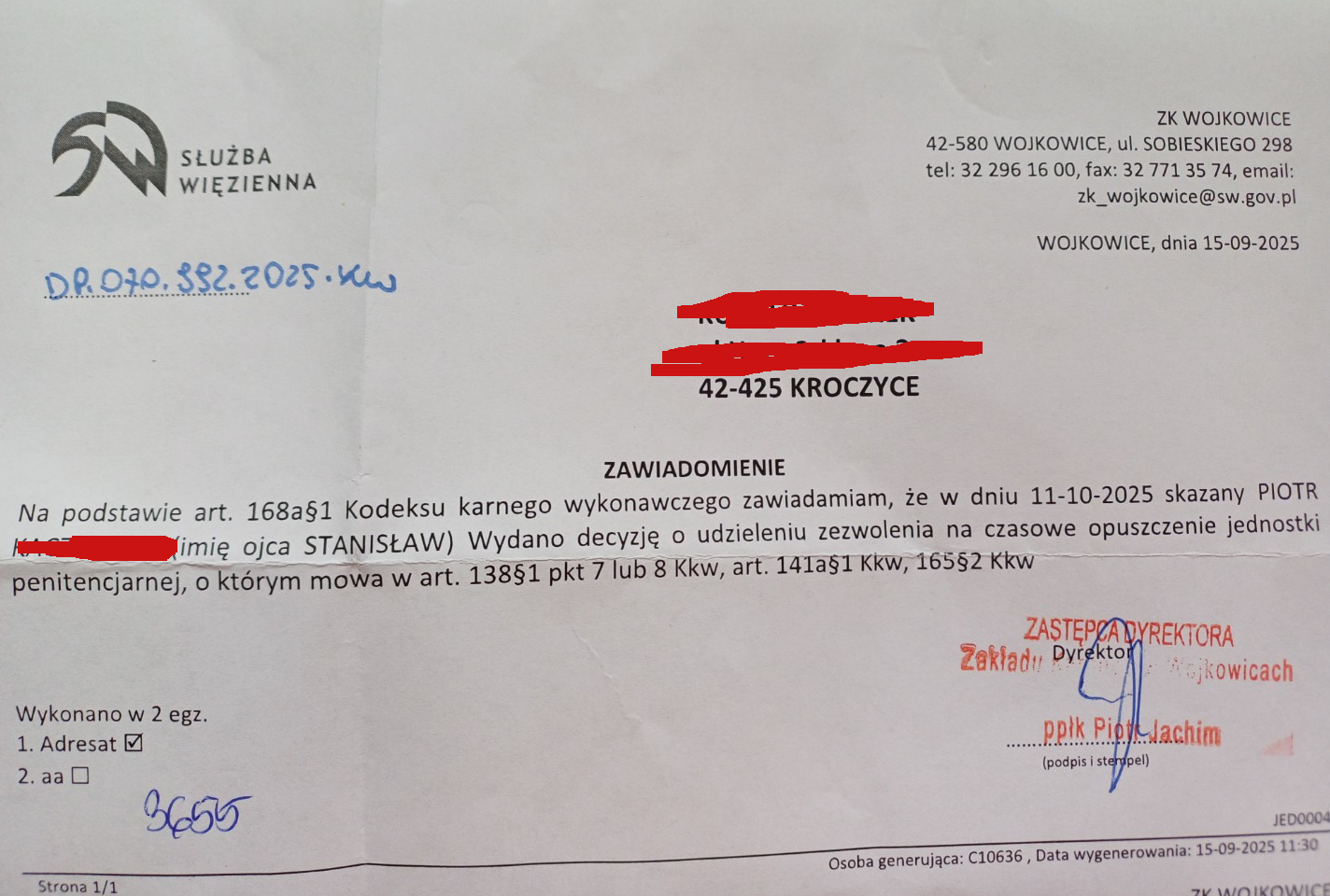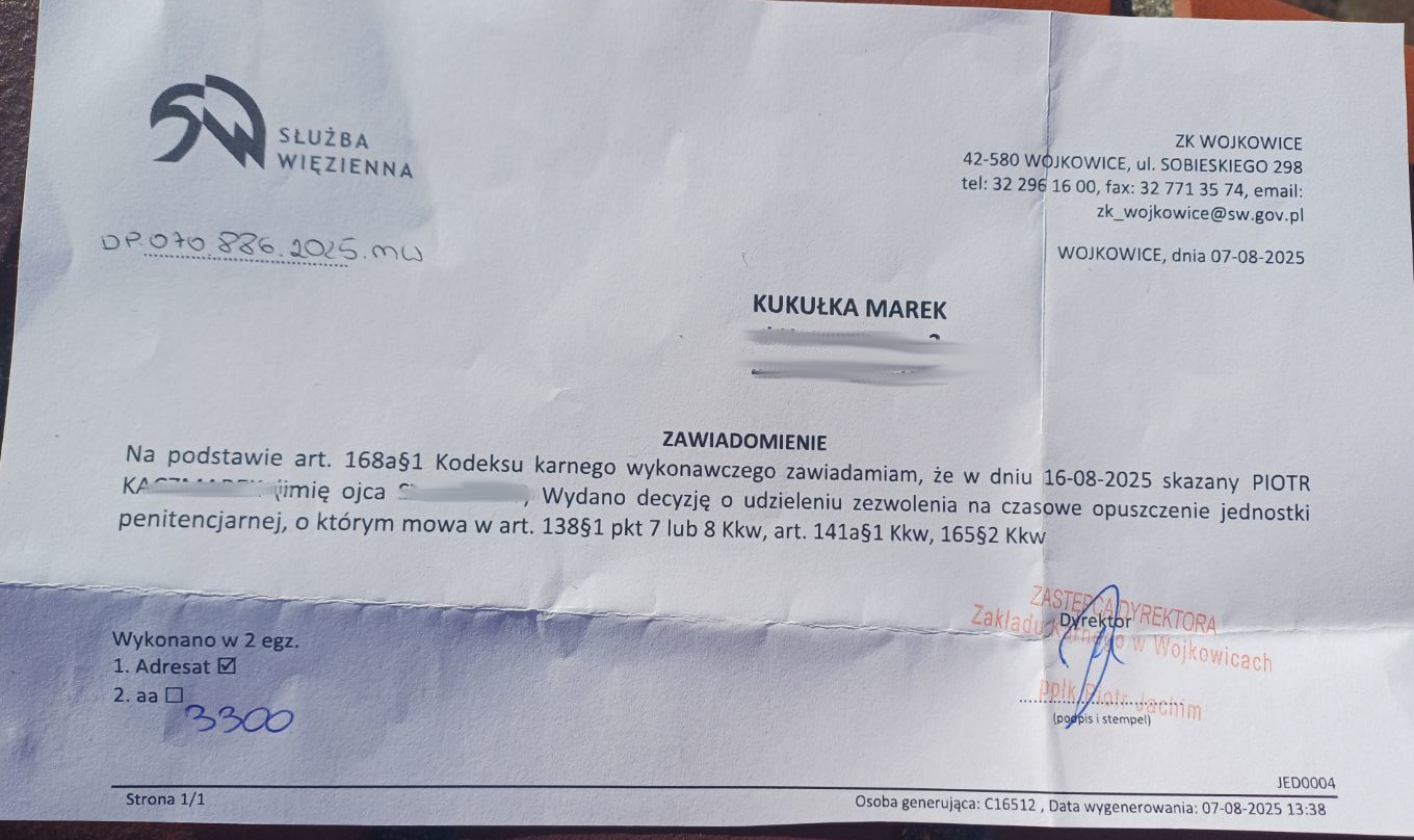 „Zawiadamiam, że w dniu 16.08.2025 skazany Piotr Kaczmarek (imię ojca). Wydano decyzję o udzieleniu zezwolenia na czasowe opuszczenie jednostki penitencjarnej”. Dalej przytaczana jest podstawa prawna. Skazanego można wypuścić z więzienia na jeden dzień, ale też maksymalnie na 14 dni.