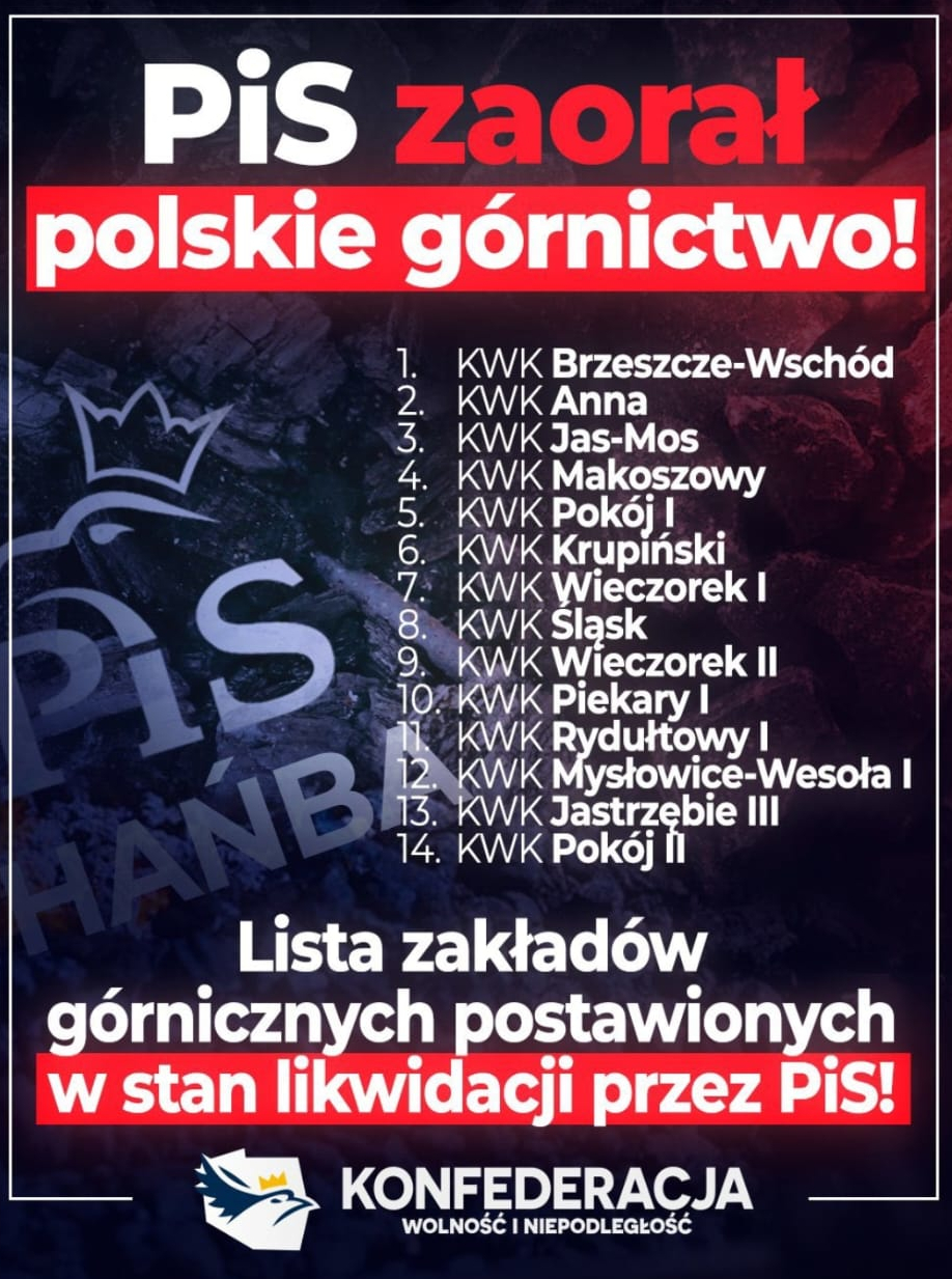 Bardzo ciekawe, co dzieje się na polskiej scenie politycznej. Politycy PiS demonstracyjnie protestują, przeciwko rozwojowi górnictwa w rejonie Myszkowa i Zawiercia, mają na koncie 14 zamkniętych kopalni, co nie jest żadną tajemnicą. Ale pewną nowością jest, że Konfederacja Wolność i Niepodległość tę dwulicowość PiS też obnaża.
