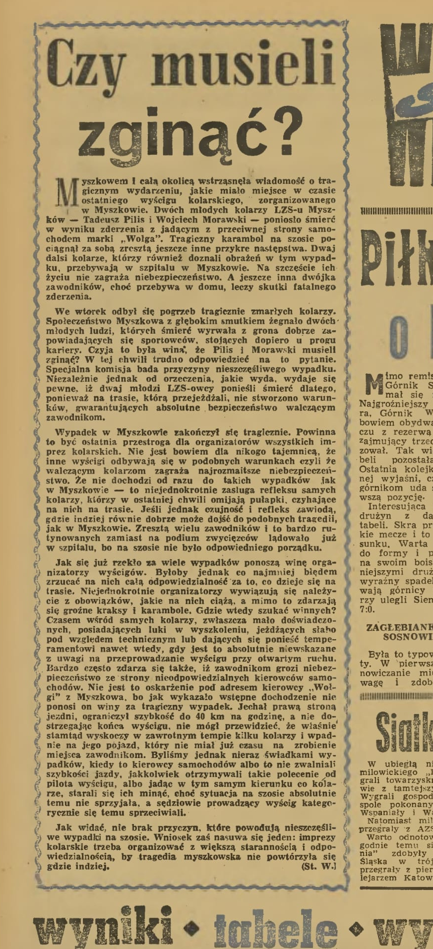 Zupełnie inaczej jest z pamięcią o wypadku w którym zginęło dwóch młodych kolarzy z LZS Myszków Tadeusz Pilis i Wojciech Morawski. Ze względu na podejrzenia o błąd milicjanta, była to wstydliwa sprawa dla władz PRL. Pamięć o zdarzeniu była tylko po cichu celebrowana w środowisku kolarskim. O tragicznym wypadku w Myszkowie zdawkowo napisały Wiadomości Zagłębia z 22 X 1965r. „Czy musieli zginąć?” -był tytuł artykułu w którym WZ spekulują o złym zabezpieczeniu trasy: „wydaje się pewne, że ponieśli śmierć, ponieważ na trasie nie stworzono warunków, gwarantujących bezpieczeństwo zawodnikom”, „powinna to być przestroga dla organizatorów imprez kolarskich”. W komunistycznych wtedy Wiadomościach Zagłębia nie ma ani słowa po podejrzeniu błędu ze strony milicjanta, o czym mówią po 60 latach świadkowie wypadku.