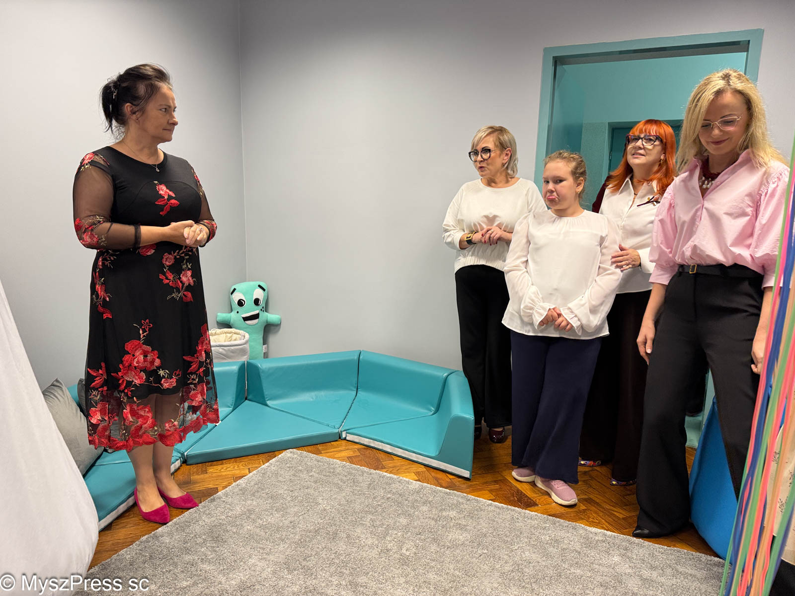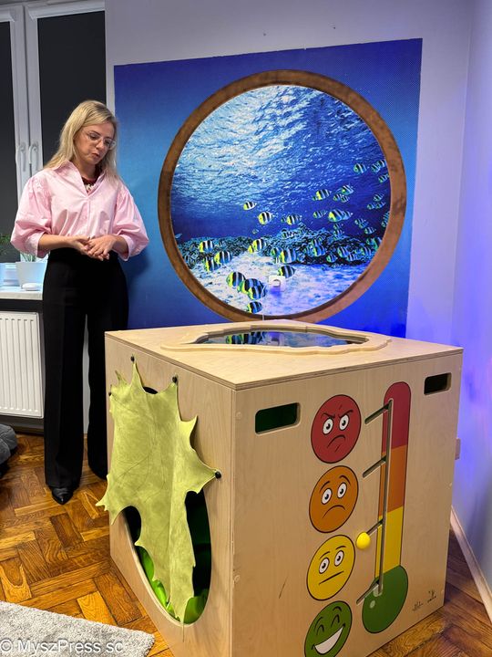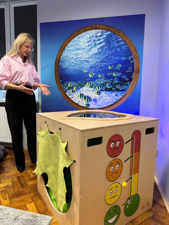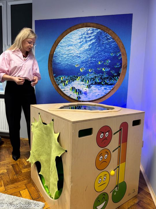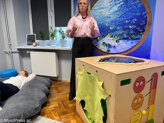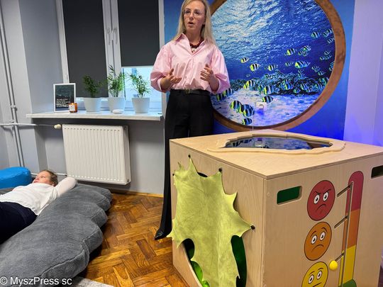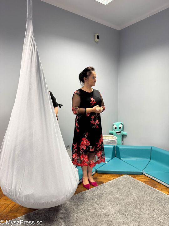 O szczególnej potrzebie urządzenia sali wyciszeń w Grzegorzewskiej mówiła gościom Aneta Kowalska, terapeuta integracji sensorycznej w szkole: -Wczoraj zaprosiłam tu dzieci. Od razu każde wybrało swoje miejsce. Jedna dziewczynka weszła do kokonu, jest też kryjówka ciszy, która wycisza i uczy emocji. Bardzo przydatna jest kołderka obciążeniowa, która pomaga dzieciom przy dużym napięciu zapewnia potrzeby potrzeby proprioceptywne. Powstało w naszej szkole wyjątkowe miejsce.