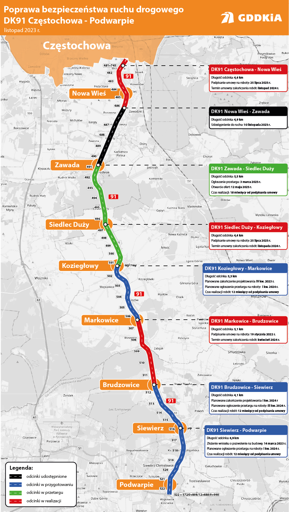 Wykonawca prowadzący prace na odcinku drogi w relacji Katowice – Częstochowa informuje, że w dniu 17 listopada 2025 r. planowane jest otwarcie wszystkich pasów ruchu w kierunku Katowice – Częstochowa, a także otwarcie pasa wolnego w relacji Częstochowa – Katowice. wWdniu 21 listopada 2025 r. udostępniony zostanie dodatkowo pas szybki w kierunku Częstochowa – Katowice.