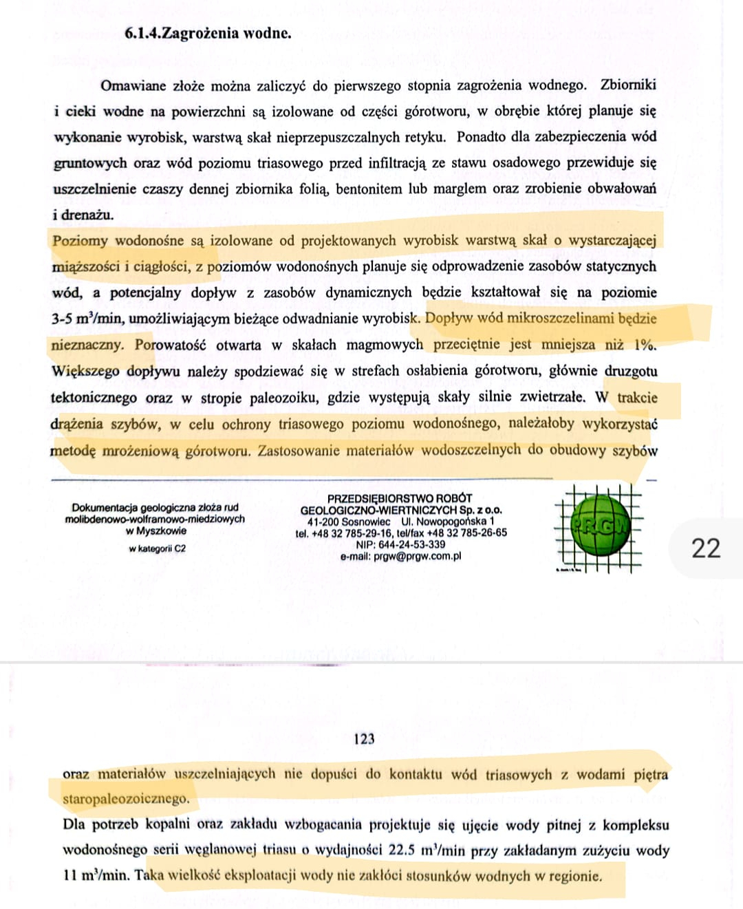 „Dla potrzeb kopalni oraz zakładu wzbogacania projektuje się ujęcie wody pitnej z kompleksu wodonośnego o wydajności 22,5 m3/minutę przy zakładanym zużyciu wody 11 m3/min. TAKA WIELKOŚĆ EKSPLOATACJI WODY NIE ZAKŁÓCI STOSUNKÓW WODNYCH W REGIONIE” - czytamy w dokumentacji.