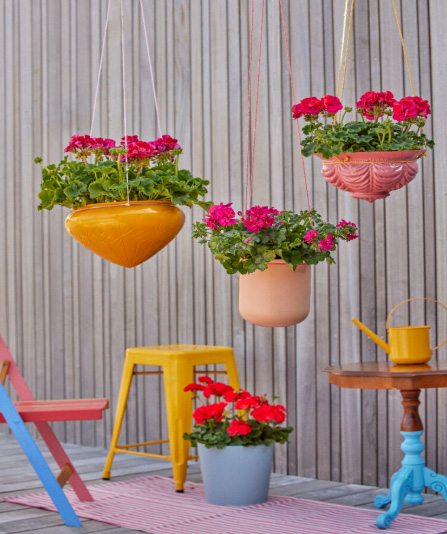 Wiszące donice – obsadzone kolorowymi pelargoniami, zmienią Twój balkon, taras lub ogród w kwitnącą oazę. Zajmują mało miejsca, są łatwe w pielęgnacji i dodają kolorów otoczeniu dzięki intensywnym odcieniom czerwieni, różu i fioletu.