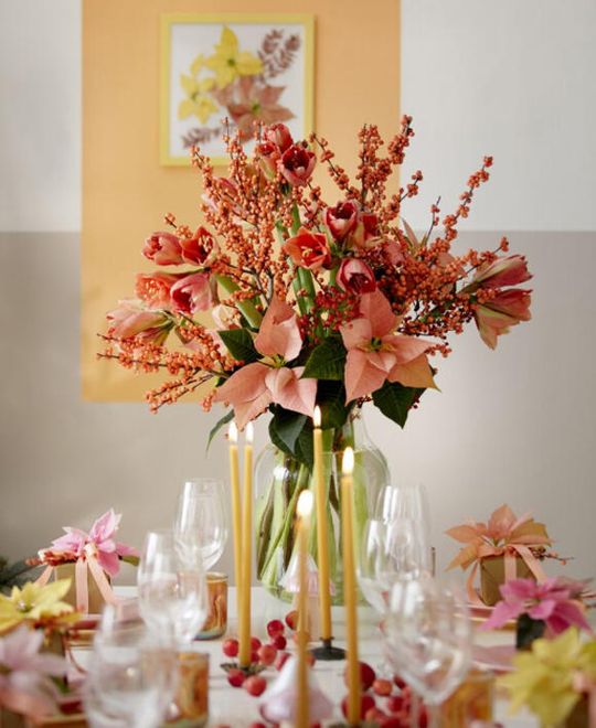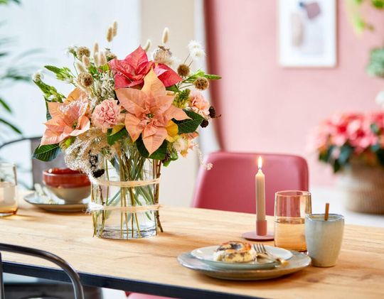 Zaczaruj swój świąteczny stół dekoracją z poinsecji: promiennie eleganckie, wspaniałe przylistki sprawią, że Twoje zaproszenie będzie niezapomniane. Odkryj dekoracje stołu z ciętymi poinsecjami dla każdego stylu wnętrza i gustu.