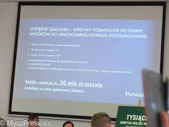 Jak wylicza Permia 1, gdyby powstała kopalnia ostrożne szacunki firmy mówią o kwocie 30 mln zł rocznie do budżetu Myszkowa. Chodzi o udział gminy w opłacie eksploatacyjnej, pit, cit, i podatki od nieruchomości. Kopalnia opłaciłaby też podatek miedziowy, ale ten w całości trafia do Skarbu Państwa. I to nie koniec korzyści, gdyż podobnie do KGHM, każda podobna kopalnia sporo wydaje na wsparcie kultury, sportu, szkolnictwa, czy służby zdrowia.