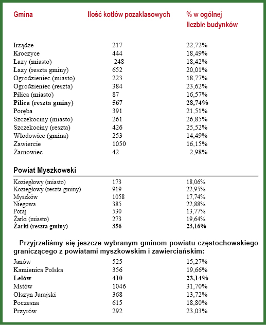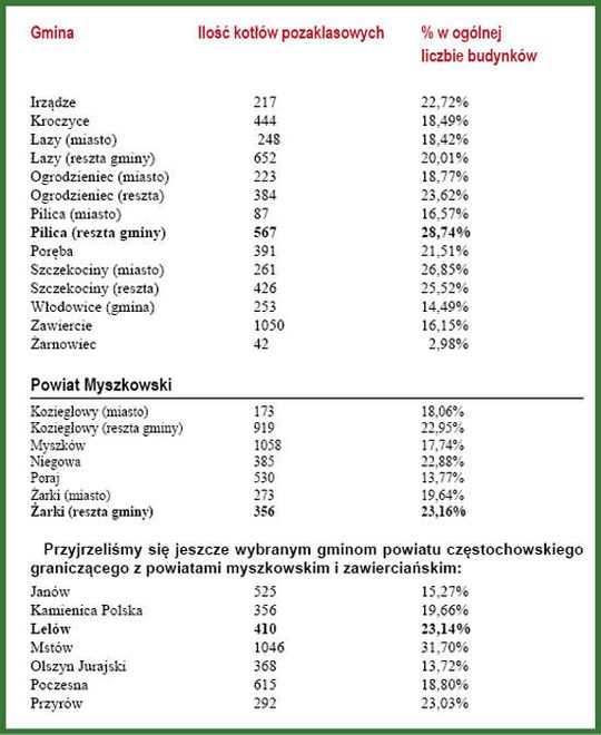 W Powiecie Myszkowskim jest podobnie. Na plus wyróżnia się gmina Poraj, gdzie kopciuchy to 13,77% kotłów ogółem, aż 530 kotłów, ale w porównaniu do reszty gmin Powiatu Myszkowskiego, zakopcona Gmina Poraj jest w pewnym sensie liderem ekologii. Na drugim miejscu Myszków, na trzecim Koziełowy. Gmin Żarki i Niegowa zimą lepiej nie odwiedzać. O apel zwłaszcza do turystów, którzy pomyslą o zimowym spacerze po Jurze. Szkoda zdrowia, lepiej zostać w dużym mieście. Ta sama uwaga dotyczy takich gmin, które swoją przyszłość widzą w turystyce: Mstów, Ogrodzieniec, czy Janów.