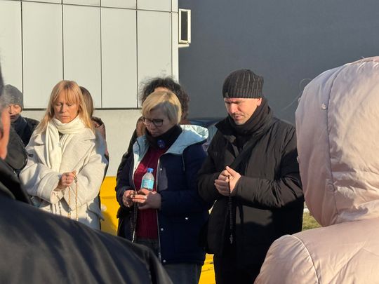Ksiądz Daniel Galus nie uczestniczył w rozprawie, sąd wezwał go na kolejną, pod rygorem pominięcia dowodu z zeznań. Wychodzimy z sądu, a przed nim jeszcze więcej zwolenników ks. Galusa. Tworzą krąg, modlą się. To trwa jakieś 20 minut. Czekamy, licząc na rozmowę z ks. Danielem Galusem. Czekamy, czekamy modlitwy trwają.