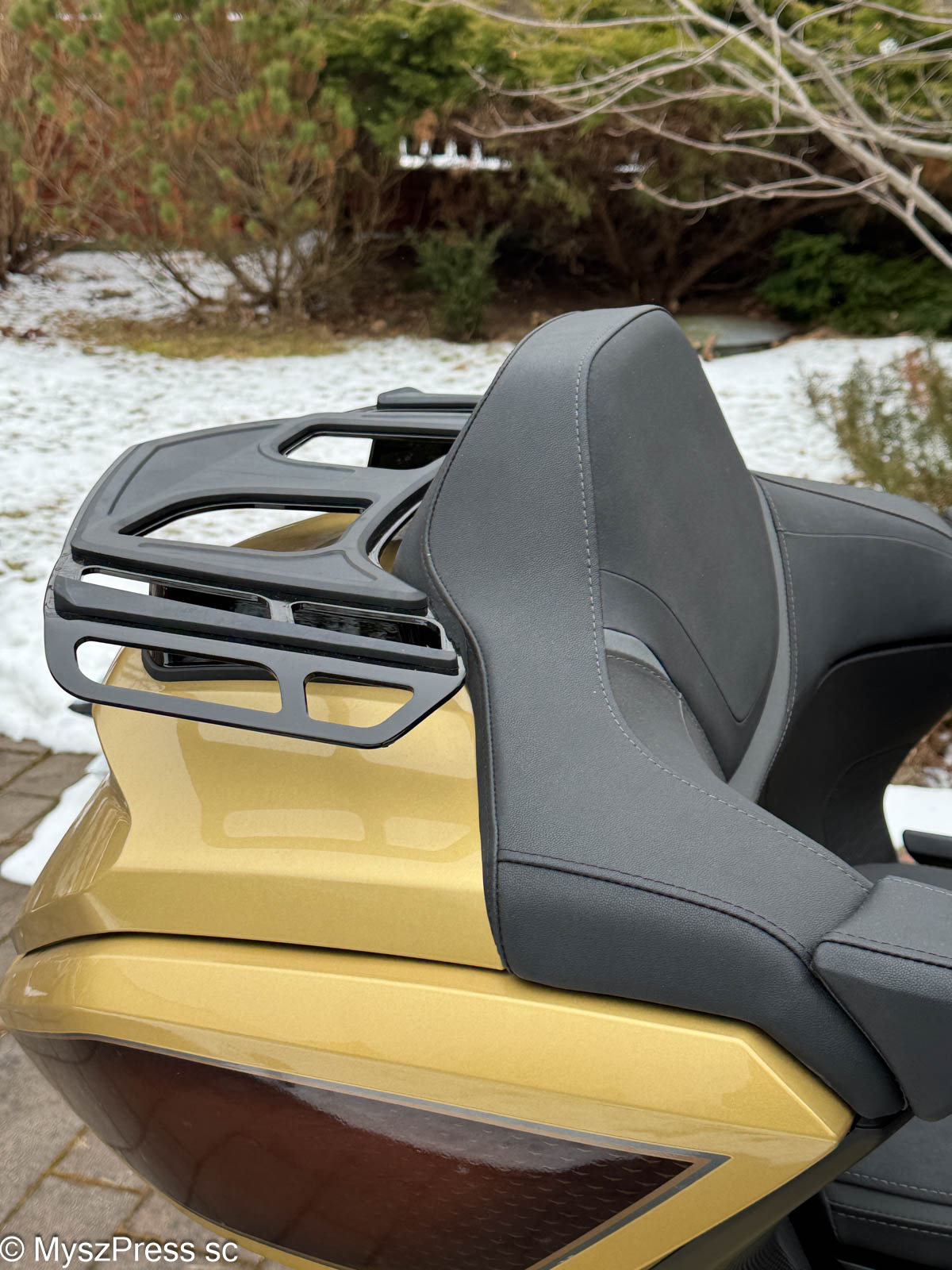 Każdy uważny motocyklista może znaleźć w katalogach Honda zdjęcia Gold Wing Tour z bagażnikiem na kufrze centralnym. To często montowane akcesorium i choć obecna wersja Hondy Gold Wing ma nawet przygotowane zaślepki umożliwiające bez wiercenia zamontować taki bagażnik, to Honda nie oferuje bagażnika w katalogu akcesoriów. Tej dziwnej sytuacji nie jest w stanie nikt oficjalnie wyjaśnić, nic naszej wiedzy nie poszerzyła rozmowa w JKK Gliwice, gdzie był zakupiony nasz Gold Wing Tour, odebrany dokładnie 19 września 2025r.