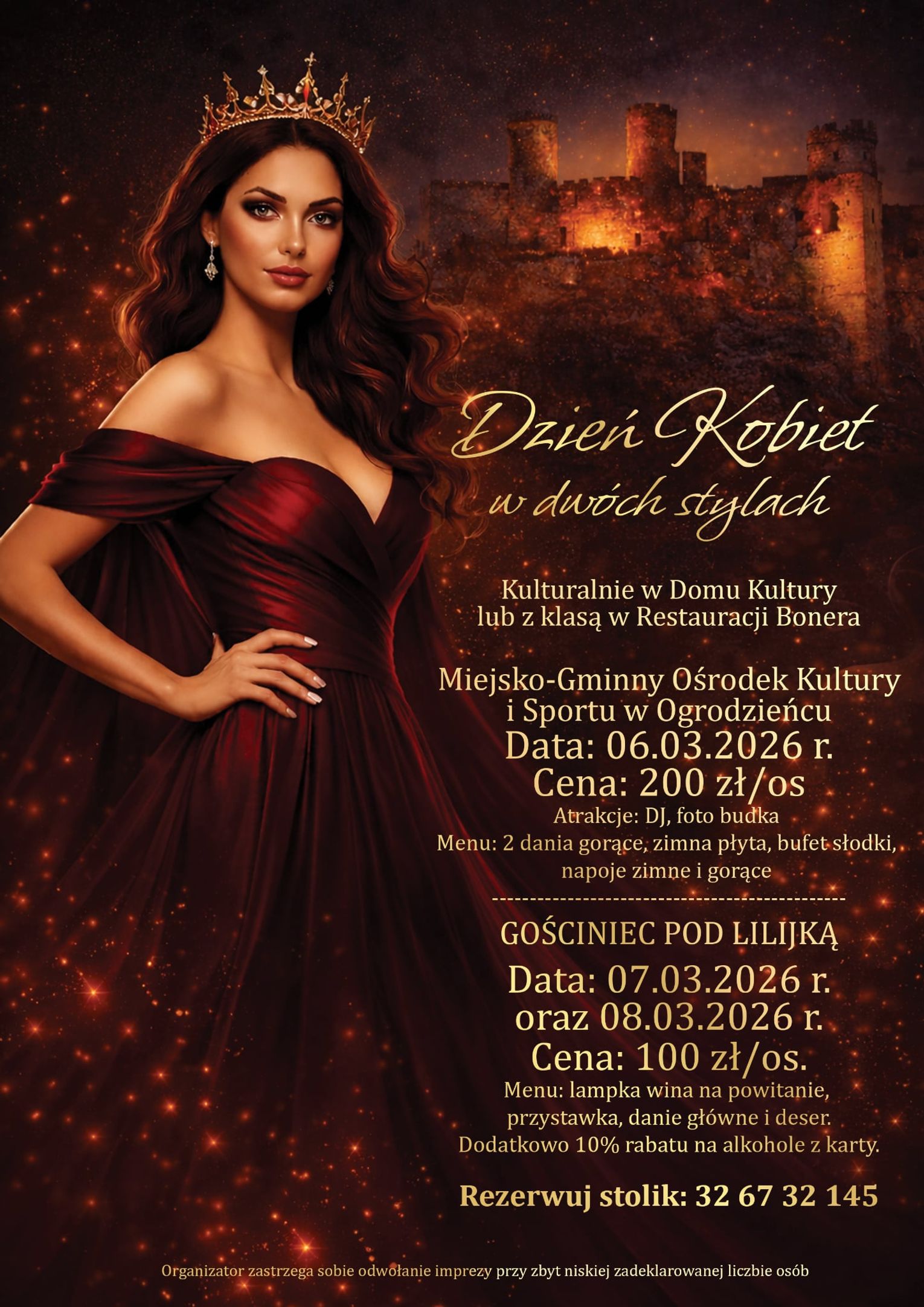 Niech ten wieczór będzie pełen radości i kobiecej energii. Serdecznie zapraszamy do wspólnego świętowania Dnia Kobiet w Ogrodzieńcu.