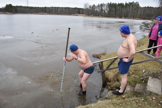 Chociaż pogoda była wiosenna, to jednak staw jest jeszcze pokryty grubym lodem. Trzeba było wyciąć przerębel. Myszkowskie morsy mają specjalną, szwedzką piłę dnao wycinania przerębli. Można było pomorsować czując oddech wiosny.