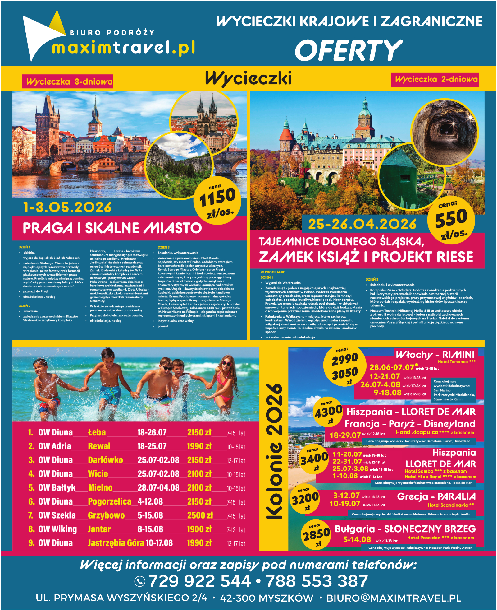 Biuro podróży Maxim Travel z Myszkowa to organizator wycieczek po Polsce, kolonii, obozów letnich i wczasów zagranicznych. W kwietniu Maxim Travel zaprasza na wycieczkę na Dolny Śląsk a w maju do Pragi. Sprawdź też ofertę wakacyjną biura!