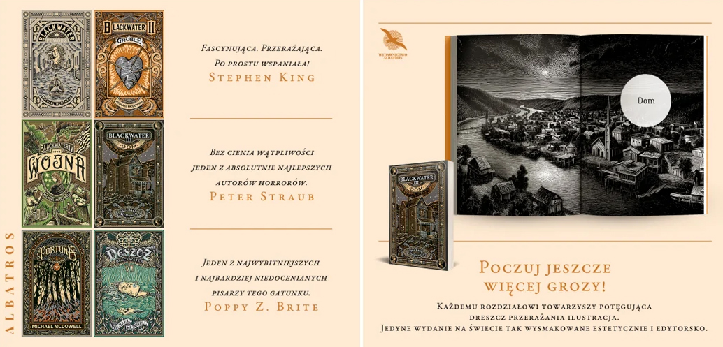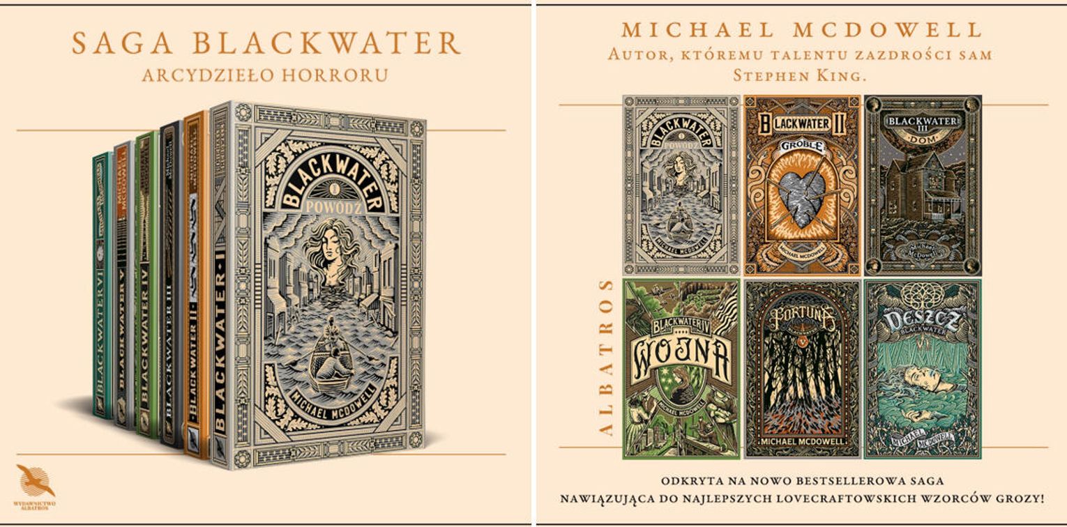 Cykl "Blackwater" to wyjątkowa niespodzianka dla miłośników literatury grozy w najlepszym, klasycznym stylu. Jestem jednak pewna, że wspaniałe – wysmakowane estetycznie i edytorsko – ilustrowane wydanie sześciotomowej sagi „Blackwater” Michaela McDowella, cenionego przez Stephena Kinga scenarzysty (autora między innymi scenariuszy do „Soku z żuka” i „Miasteczka Halloween” Tima Burtona, serialu telewizyjnego „Opowieści z krypty”, czy filmowej adaptacji powieści „Chudszy” Kinga) oraz powieściopisarza, tworzącego głównie horrory w nurcie amerykańskiego południowego gotyku, zachwyci i porwie nie tylko fanów gatunku.