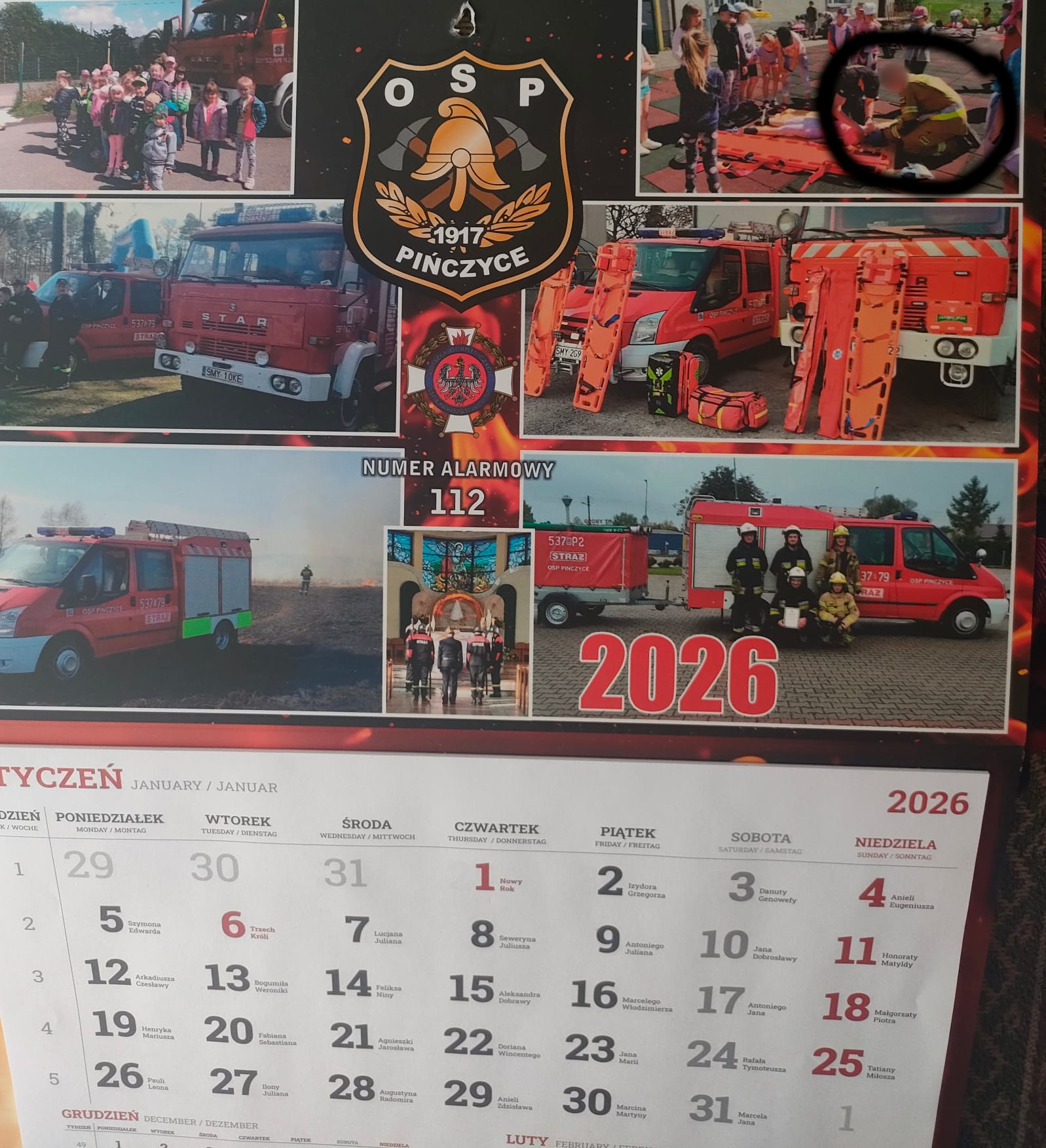 Od mieszkańców Pińczyc dostaliśmy Kalendarz Strażacki OSP Pińczyce. Tegoroczny, wydanie na 2026 rok. Wisi prawie w każdym domu w Pińczycach. Na jednym ze zdjęć, oczywiście przy dzieciach Mateusz R. w roli ratownika.