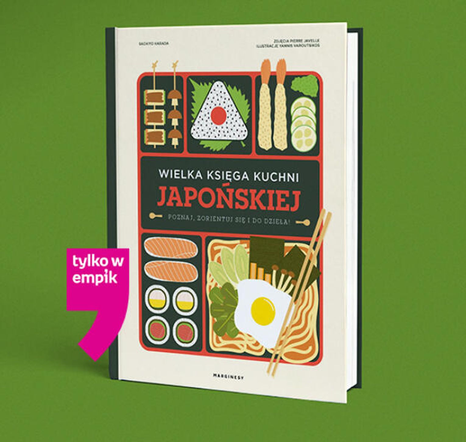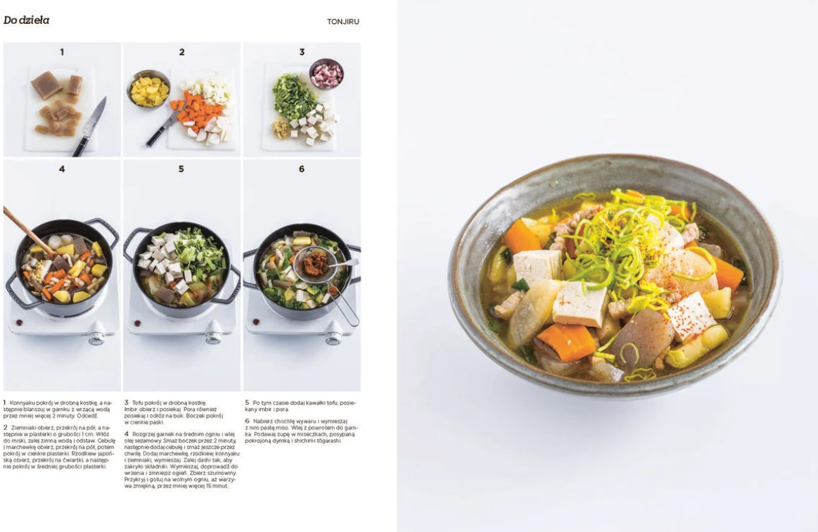 A potem już tylko gotuj! Zrób esencjonalne i klarowne dashi, rozgrzej się zupą tonjiru z soczystą białą rzodkwią i mieszanką siedmiu przypraw, zaserwuj gustowne sashimi z przegrzebków, wykorzystaj ulubione warzywa do otulającego placka okonomiyaki (japońskie okonomi oznacza „to, co lubisz”!), zachwyć bliskich szaszłykami yakitori i deserem ichigo daifuku – ciastkami z kleistej mąki ryżowej z dodatkiem zielonej herbaty, nadziewanymi słodką pastą z czerwonej fasoli i truskawką.