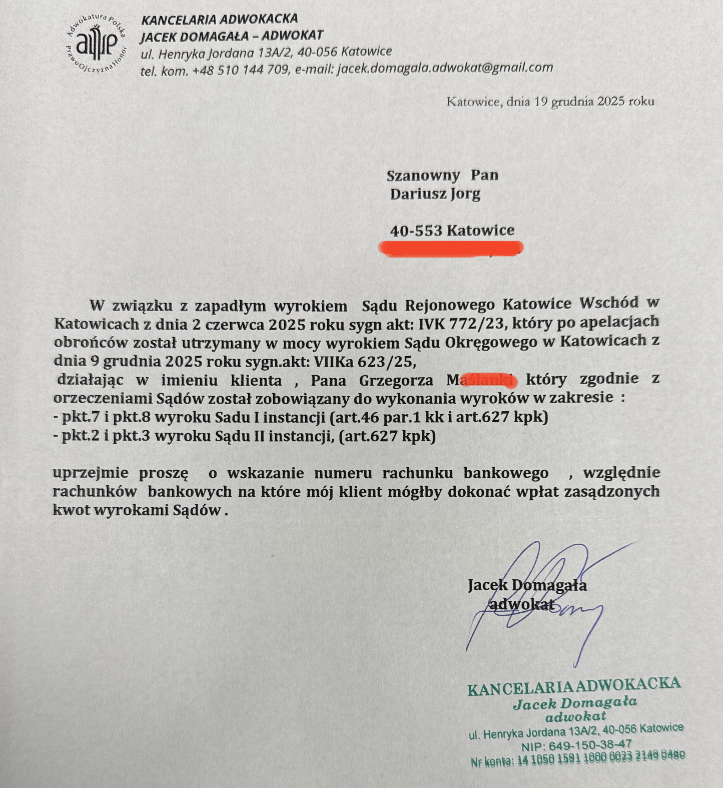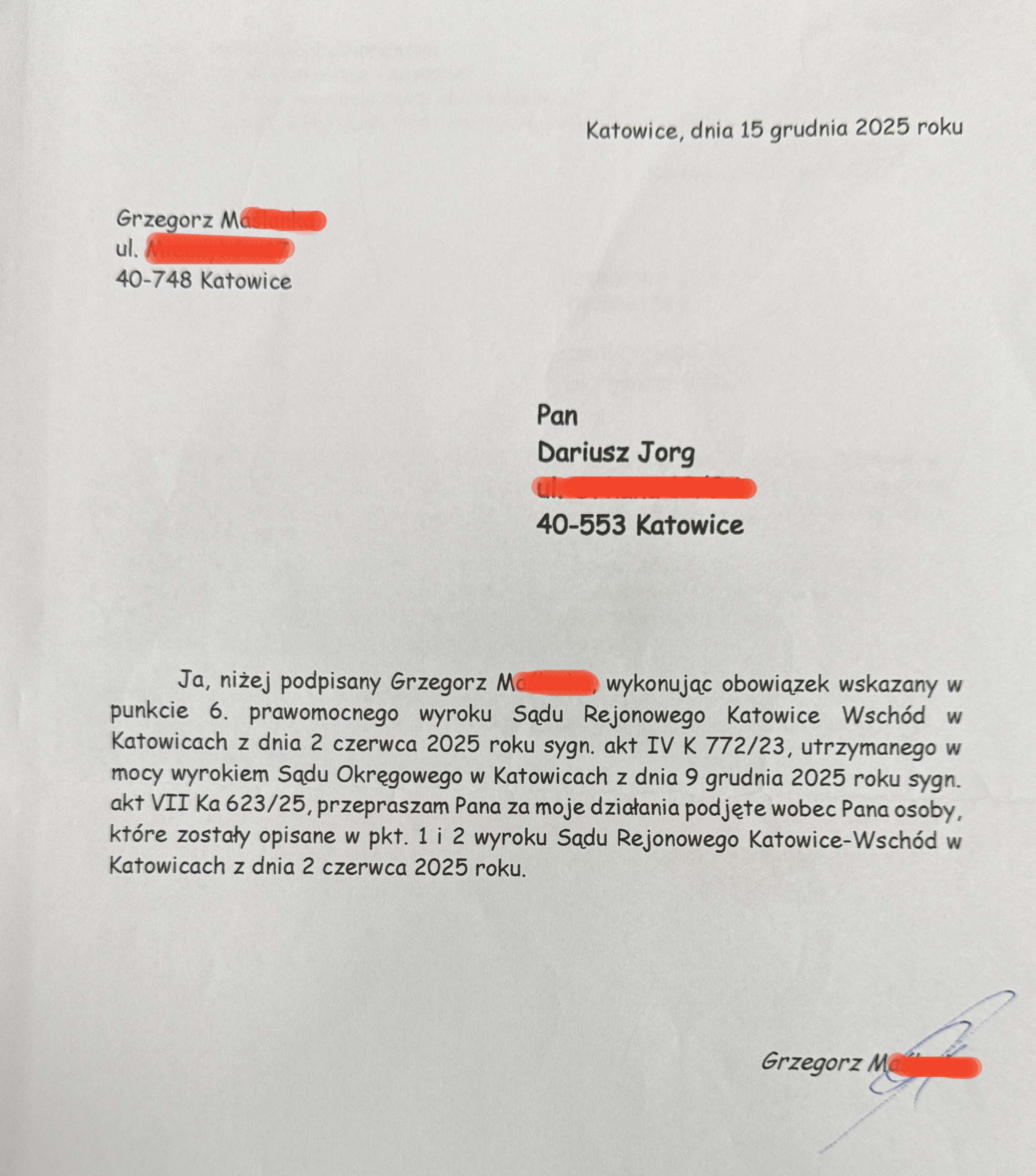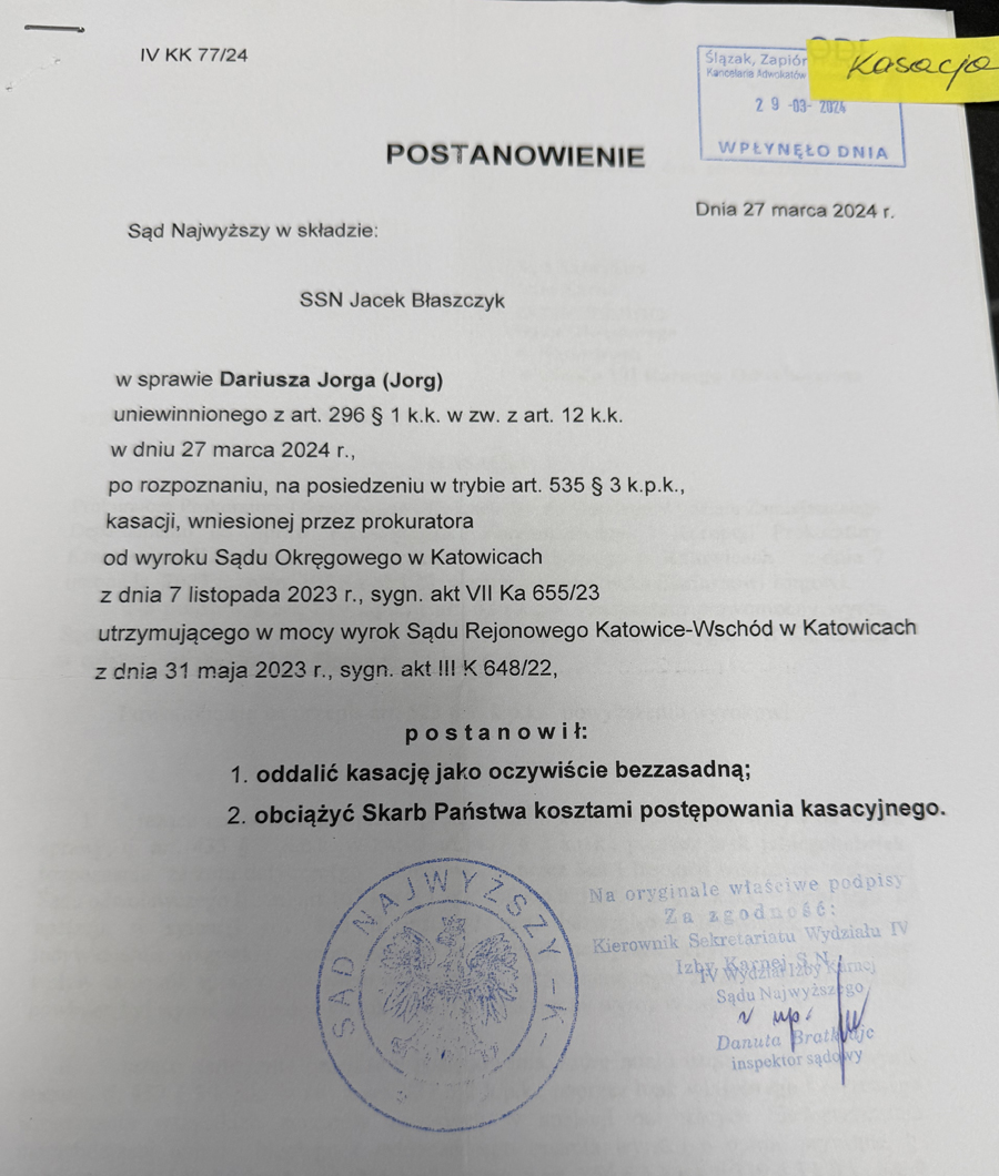 Jako pierwsi piszemy o oczyszczeniu Dariusza Jorga ze wszystkich zarzutów. Co więcej, w osobnym procesie, prawomocnym pod koniec 2025 roku Grzegorz M. został skazany za składanie fałszywych, obciążających Dariusza Jorga i inne osoby. Chodzi o jego zeznania które przed CBA składał latach 2015-16 przed Centralnym Biurem Antykorupcyjnym. Zgodnie z prawomocnym wyrokiem skazującym musiał oficjalnie przeprosić Dariusza Jorga oraz zapłacić mu 30.000 zł tytułem zwrotu kosztów i zadośćuczynienia. Został też skazany na karę łączną 1 roku pozbawienia wolności z zawieszeniem wykonania kary na okres lat dwóch, 10 tysięcy grzywny i inne koszty procesu.