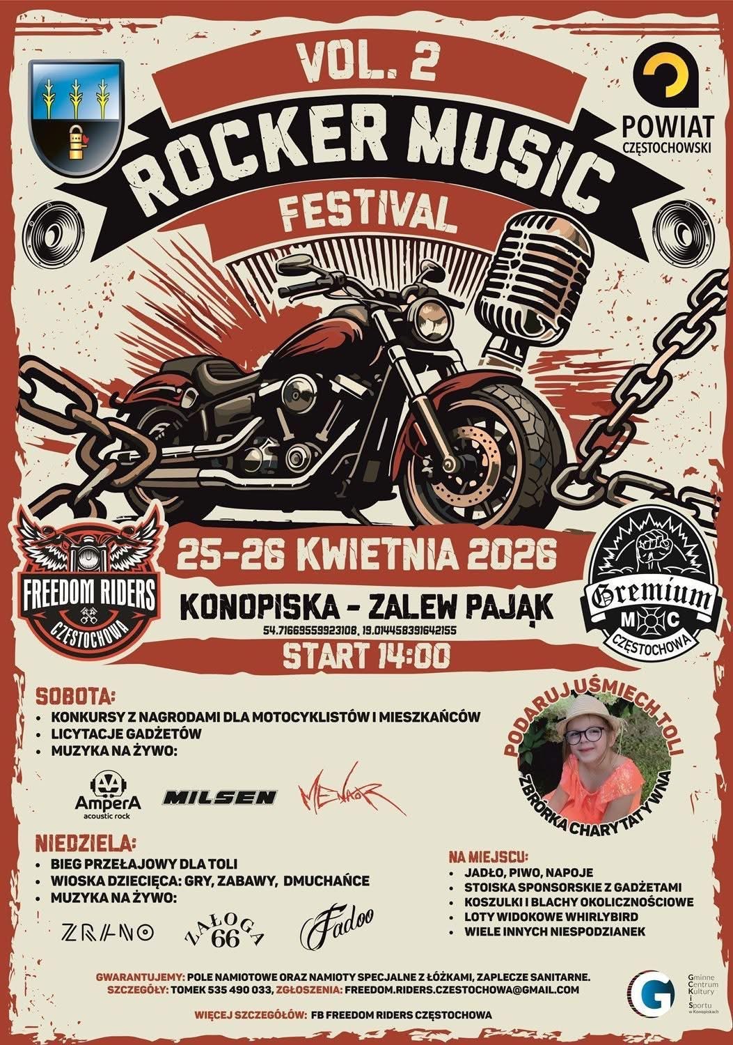 Ostatnie wydarzenie, czyli dwudniowy zlot w Pająku (Gmina Konopiska) to zlot motocyklowy połączony z imprezą charytatywną dla Toli. Motocyklowym organizatorem (oprócz gminy) jest częstochowska grupa motocyklistów Freedom Riders. Jak ktoś chce, to klub zapewni mu łóżko do spania w namiocie, ale trzeba zadzwonić do Tomka: 535490033. Na pisanie to już może zbyt późno: [email protected]