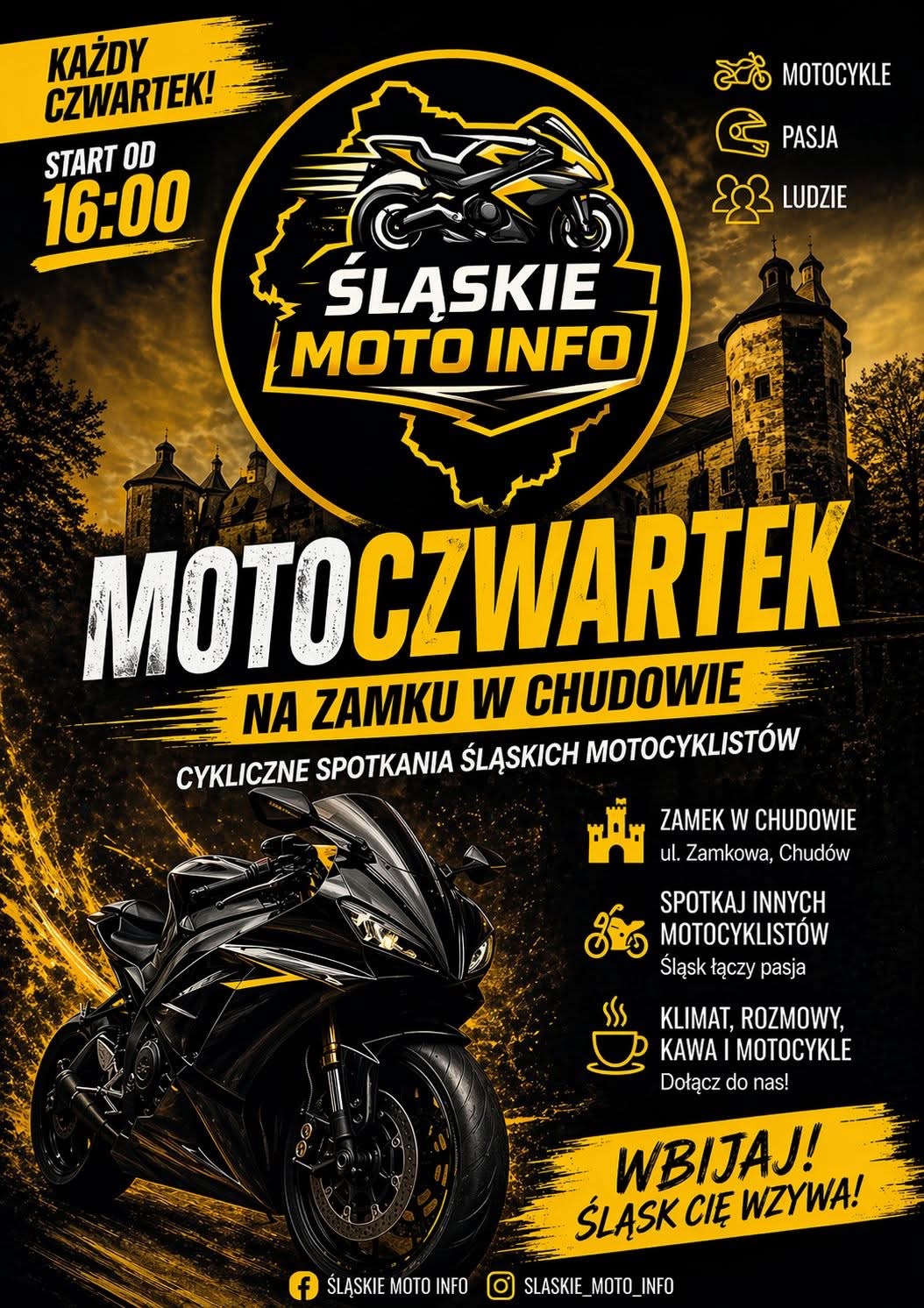 Innim cyklicznym wydarzeniem, które w tym tygodniu już się odbyło, jest MOTOCZWARTEK na zamku w Chudowie. W każdy czwartek spotkacie tam kogoś na moto z kim będzie można pogadać.