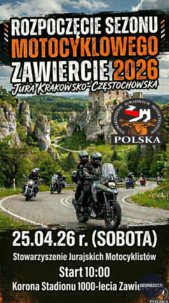 Stowarzyszenie Jurajskich Motocyklistów i Miasto Zawiercie zapraszają motocyklistów na rozpoczęcie sezonu w malowniczej scenerii Jury Krakowsko-Częstochowskiej. W programie spotkanie na Stadionie 1000-lecia, przejazd do Bazyliki, Msza Święta, parada ulicami miasta i przejazd do Rzędkowic. Uczestnicy otrzymają kiełbaskę z ogniska oraz jurajski żurek.
