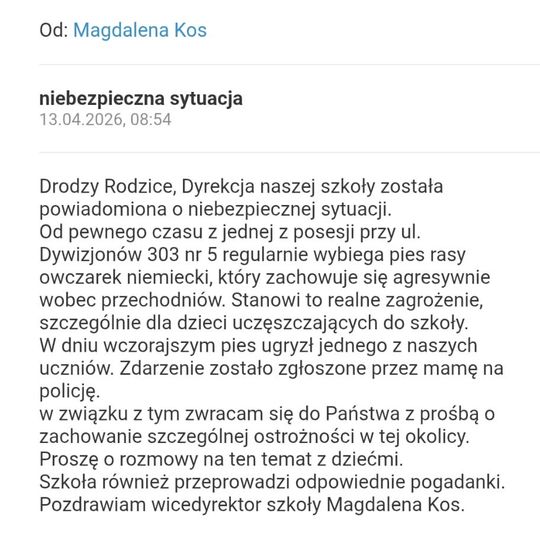 Oficer prasowa KPP Myszków potwierdza, że policja w sprawie pogryzionej pani Bożeny zrobiła tylko notatkę, a zdarzenie zakwalifikowano jako wykroczenie. Właścicielkę psa ukarano mandatem za niedopilnowanie zwierzęcia. Nie wiadomo na jakiej podstawie Policja uznała, że zdarzenie jest tylko wykroczeniem. Pani Bożena leczy rany już 1,5 miesiąca. W tym czasie Bambo uciekał podobno wiele razy, a 12 kwietnia pogryzł Aleksandra, ucznia Szkoły Podstawowej nr 1 Myszkowie. Dzień późnej wicedyrektorka SP 1 Magdalena Kos pisze do rodziców i dzieci aby uważali na agresywnego owczarka niemieckiego który atakuje przechodniów. Podaje adres posesji, z której ucieka pies: ulica Dywizjonu 303, dom nr 5. Bambo gryzie ludzi po całej dzielnicy, więc w na Mijaczowie praktycznie nie ma bezpiecznych miejsc. Chyba, że łańcuch, na którym teraz jest uwięziony, wytrzyma.