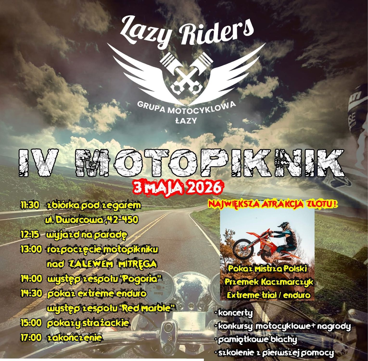 Rok temu odwiedziliśmy III Motopiknik. Nasze redakcyjne Moto Guzzi V7 Racer z 2015r wzięło nawet udział w paradzie, którą organizatorzy poprowadzili chyba najbardziej dziurawymi drogami w gminie. Chyba, że wszystkie są takie i innej trasy wyznaczyć się nie dało. Może to był świadomy zamysł, żeby pokazać że Łazy nie są gminą "mlekiem i miodem płynącą"? W tym roku jeżeli uda nam się wpaść do Łaz, to chyba damy azymut od razu na Zalew Mitręga. I w tym roku będzie to Honda Gold Wing Tour '50 Anniversary, w redakcji "na służbie" od września 2025