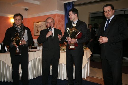 Na tym zakończyliśmy część oficjalną gali, ale ku naszemu zaskoczeniu okazało się, że to nie koniec nagród. Najpierw klub Olimpijczyk Szczekociny wręczył specjalną statuetkę Wojciechowi Łubiance, bez którego - jak powiedział Darek Skorupa - nie odbyłyby się 73 Mistrzostwa Polski w Kolarstwie Przełajowym w Szczekocinach. Dwa okazałe puchary otrzymała nasza redakcja od starostwa powiatowego w Myszkowie. Starosta Łukasz Stachera wraz z zastępcą Janem Kierasem wyróżnili nasze wydawnictwo za promocję kultury fizycznej i sportu.