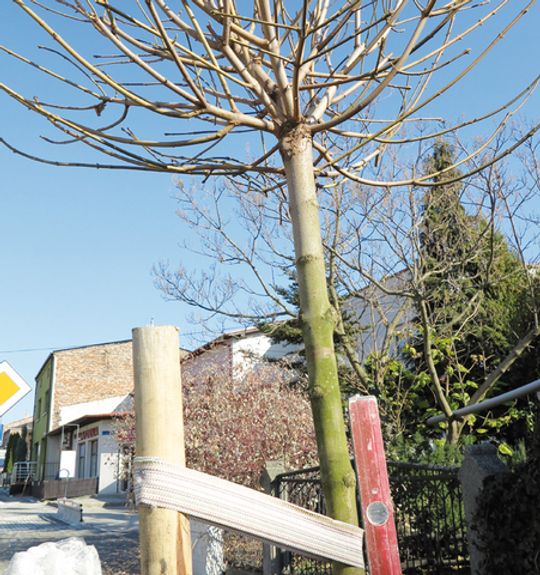 (Myszków) Remont ulicy 3 Maja w Myszkowie jest już niemal na finiszu. Ta część ulicy od strony dworca upiększona została niedawno klonami. Problem w tym, że drzew nie posadzono prosto. Niby paliki mające przywrócić je do pionu mają – po jednym dla każdego drzewa… ale ich prostota też pozostawia wiele do życzenia.