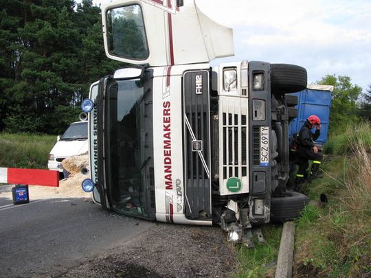 (Myszków) O sporym szczęściu mogą mówić kierowcy, którzy w środę 12 sierpnia tuż przed godziną 18.00 czekali na przejazd pociągu na rogatkach przy ul. Koziegłowskiej w Nowej Wsi. Tuż obok stojących przed szlabanem aut wywróciła się ciężarówka z przyczepą. W groźnie wyglądającym wypadku nikt na szczęście nie został ranny. Tylko dzięki opanowaniu kierowcy ciężarowego auta nie doszło do niewyobrażalnej tragedii.