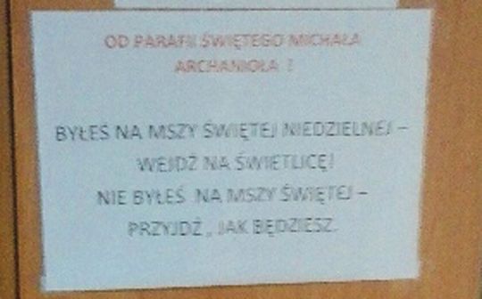 (Pińczyce) „Byłeś na mszy świętej niedzielnej – wejdź na świetlicę, nie byłeś na mszy świętej – przyjdź, jak będziesz – kartka o takiej treści została zawieszona w świetlicy środowiskowej „Pod Aniołem”, działającej w Pińczycach. O dyskryminacji dzieci poinformowała nas jedna z matek, we wtorek 25 października. Świetlica finansowana jest z budżetu Miejsko-Gminnego Ośrodka Promocji Kultury w Koziegłowach, więc tym bardziej kobieta była oburzona postępowaniem proboszcza.