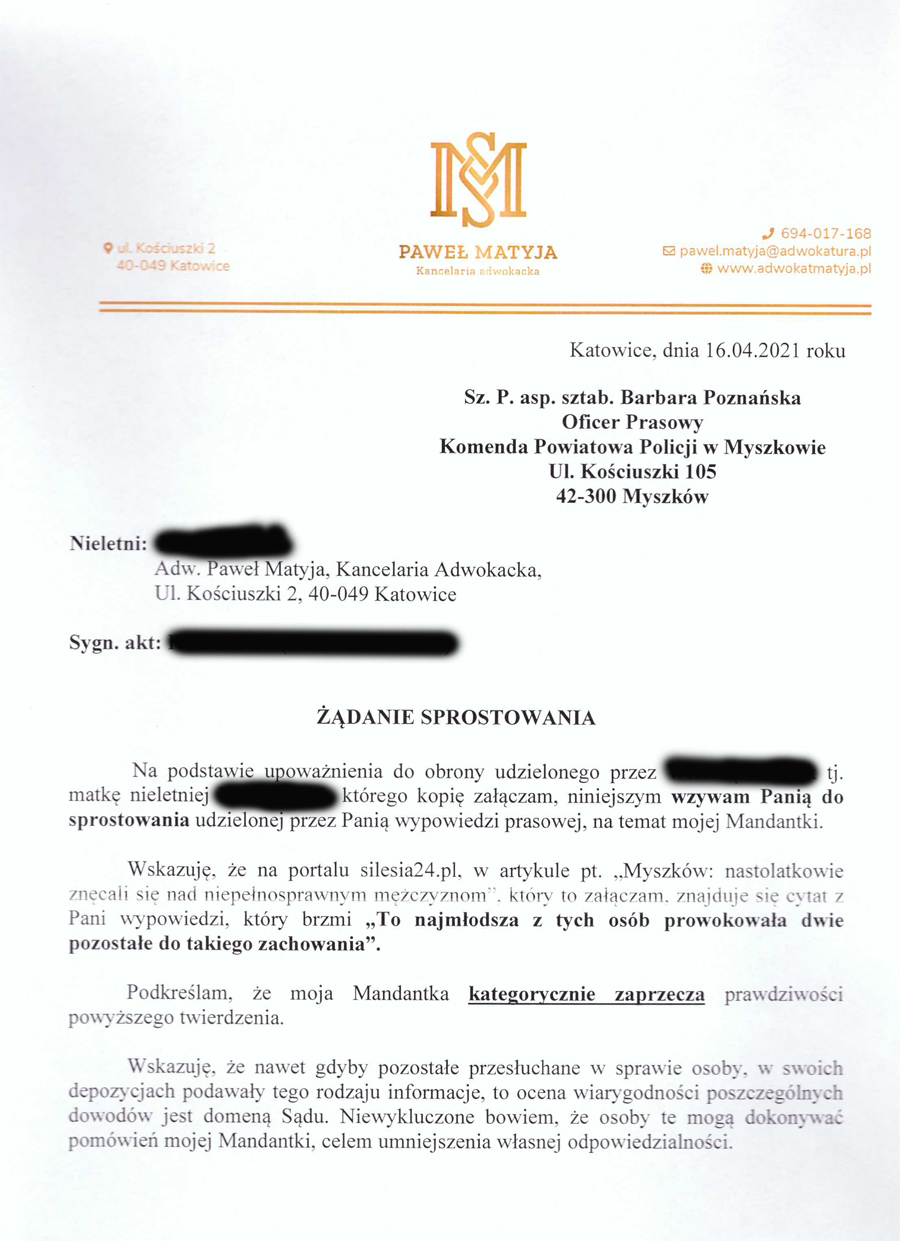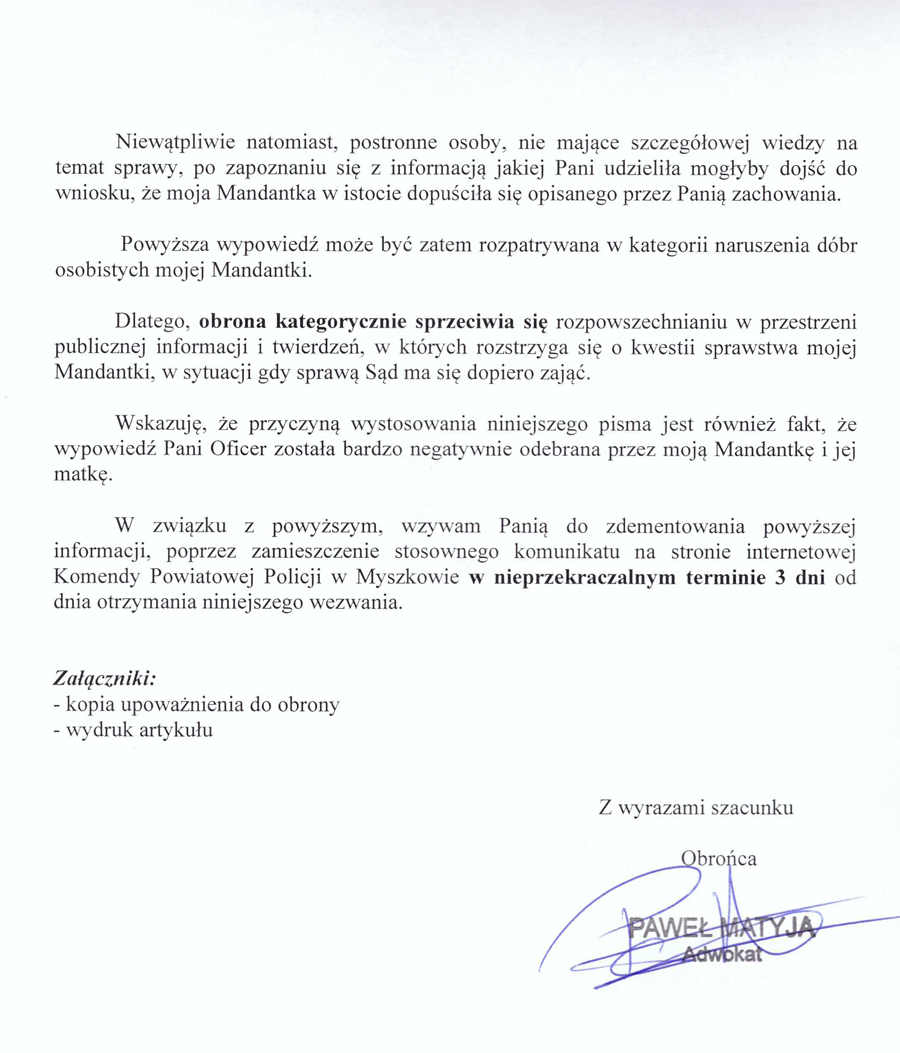 Do KPP Myszków trafiło już żądanie sprostowania informacji rzeczniczki myszkowskiej policji skierowane przez adwokata Pawła Matyję. Jego treść można przeczytać w zdjęciach do tekstu.