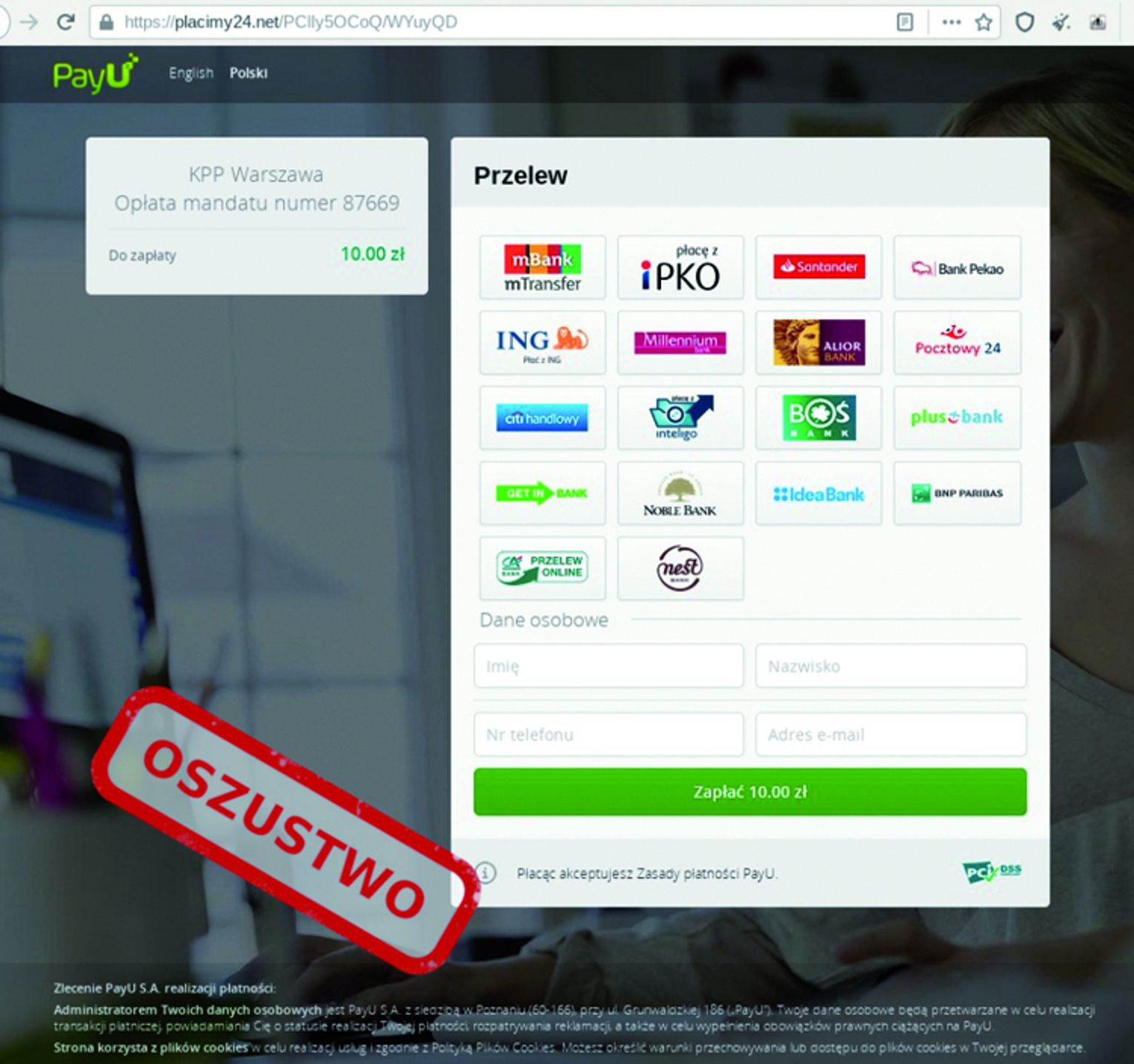 Oszuści wysyłają krótkie SMS-y do losowo wybranych osób. Fałszywe wiadomości informują o konieczności zapłaty zaległego mandatu karnego. Wskazana w nich jest też data skierowania sprawy do sądu lub do komornika. Kwota rzekomej zaległości nie jest wysoka – np. 10 złotych. Jako nadawca wiadomości wyświetla się „Policja”, co ma uśpić czujność odbiorców i uczynić taką wiadomość bardziej wiarygodną. W SMS znajduje się link – po jego kliknięciu zostajemy przekierowani na stronę internetową, która ma służyć do zalogowania się na swoje konto bankowe. Komenda Powiatowa Policji w Myszkowie ostrzega, że jest to oszustwo.