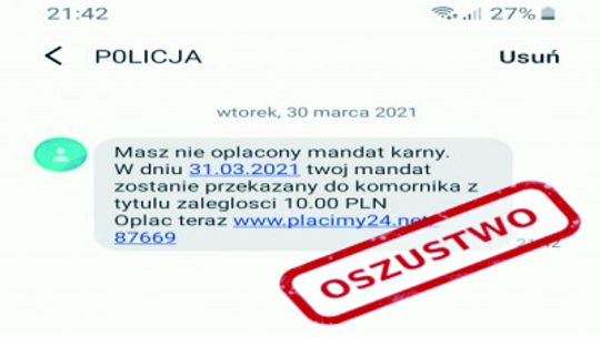 Warto pamiętać, że Policja nigdy nie wysyła żadnych wiadomości przypominających o zaległych mandatach. Żaden urząd, instytucja publiczna, firmy kurierskie też nie działają w ten sposób. Jakiekolwiek SMS-y lub e-maile, informujące o o konieczności dopłaty (np. za wysłaną do nas paczkę lub zapłaty za szczepionkę) to oszustwo.